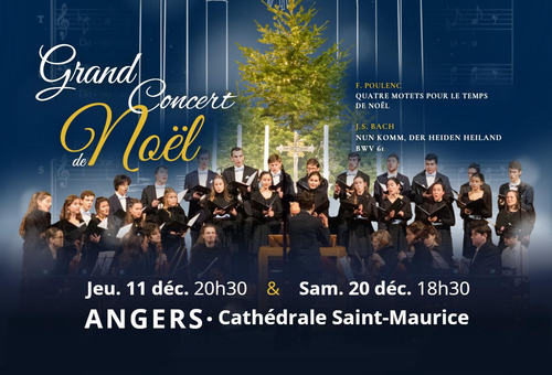 Une nouvelle fois, le Chœur Ad Cælum vous invite pour son traditionnel GRAND CONCERT DE NOËL 2025. Dans la pénombre de la cathédrale d’Angers et à la lueur des bougies, venez découvrir un programme musical de Noël au cœur de l’Avent. Préparons-nous au grand mystère de Noël avec la cantate 61 « Nun komm, der Heiden Heiland » de J.S. Bach, les « Quatre motets pour le temps de Noël » de F. Poulenc et de nombreuses autres œuvres traditionnelles de Noël.